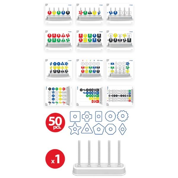 Zestaw zawiera w komplecie korale różniące się nie tylko kolorem, ale i kształtem. Sortowanie staje się trudniejsze, gdyż dziecko obserwuje dwie cechy jednocześnie.