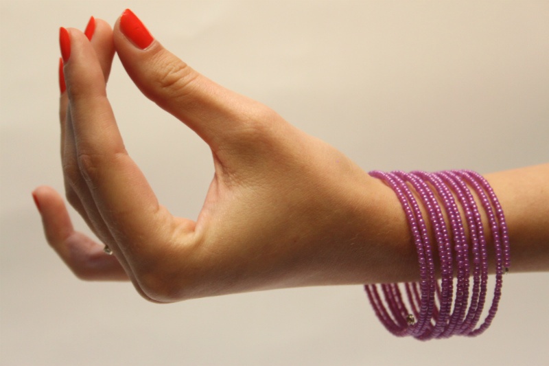 Delikatna bransoletka ze szklanych koralików w modnym kolorze. Szczególnie dobrze prezentuje się na opalonej ręce.